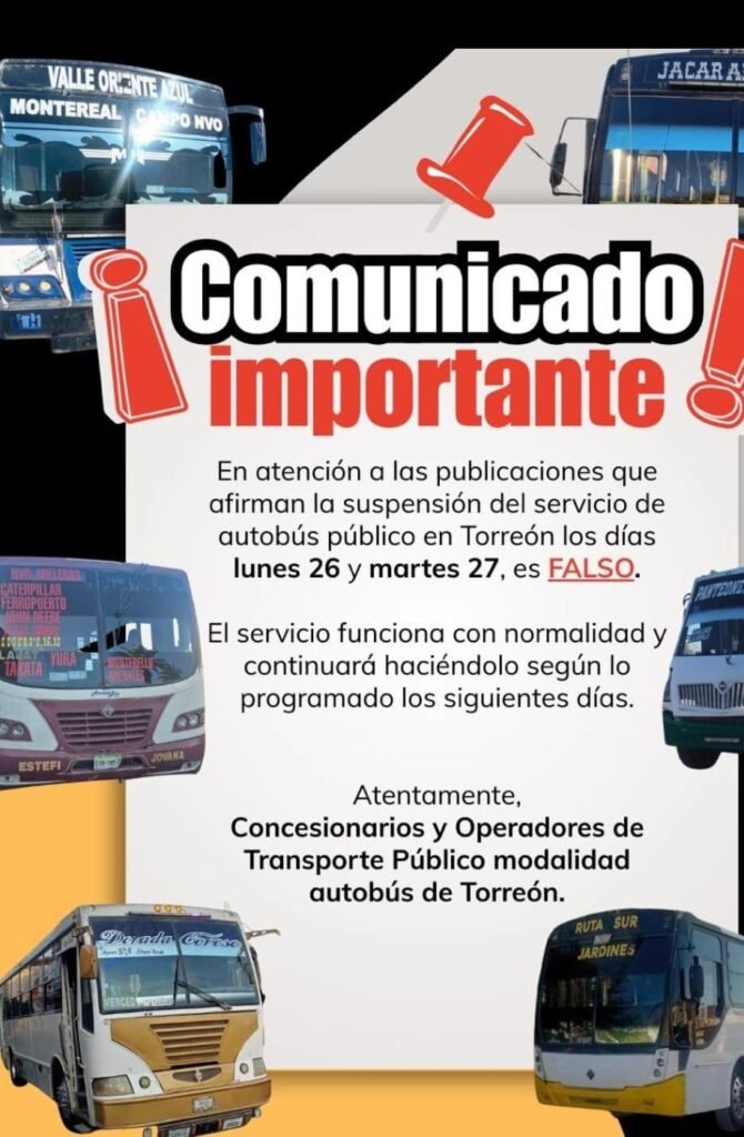Ante esa anuncio, concesionarios y operadores del transporte público modalidad autobús de Torreón, emitieron un comunicado para informar que era falso el paro.