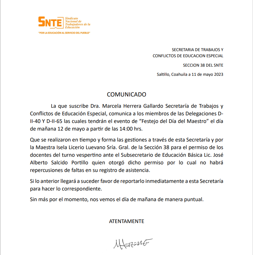 Le comento. Circula en redes sociales un supuesto oficio de la doctora Marcela Herrera Gallardo, titular de la Secretaría de Trabajos y Conflictos de Educación de la Sección 38 del SNTE.