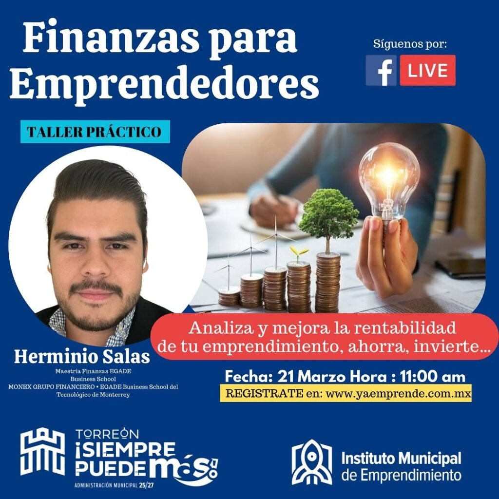 Torreón, Coahuila.- El Instituto Municipal del Emprendimiento de Torreón (IMET) invita a la ciudadanía interesada en negocios a formar parte de su taller práctico “Finanzas para Emprendedores”.