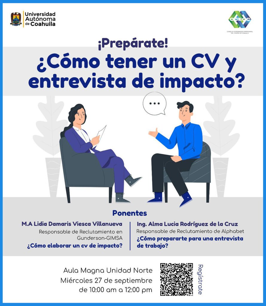 Monclova, Coahuila.- La Universidad Autónoma de Coahuila a través de la Coordinación General de Vinculación e Innovación Productiva, en colaboración con el Consejo de Vinculación Universidad Empresa de Monclova, invitan al evento ¿Cómo tener un CV y Entrevista de impacto? Que se realizará este miércoles 27 de septiembre a las 10:00 horas, en el Aula Magna de la Unidad Norte (UN).