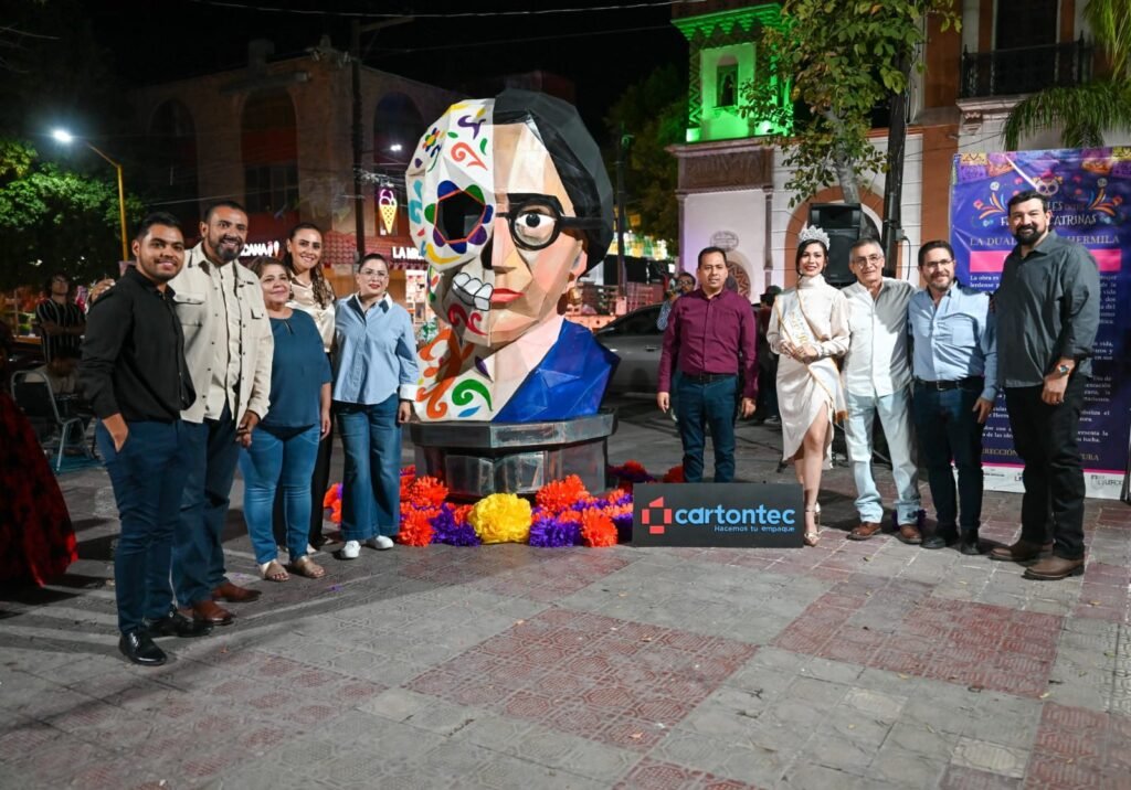 Posteriormente hicieron el corte de listón de la Mega Catrina de 10 metros instalada frente al asta bandera de la plaza principal (misma que se encuentra entre avenida Francisco Sarabia y calle Hidalgo), y fue donada por el Instituto de Cultura del Estado.