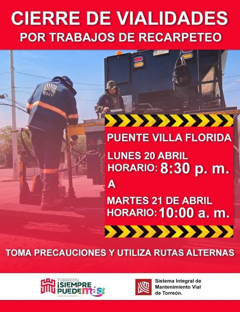 Torreón, Coahuila.- Con la finalidad de reforzar los últimos detalles de la obra del Sistema Vial Villa Florida, este lunes el personal del Sistema Integral de Mantenimiento Vial (SIMV), realizará trabajos de colocación de micro carpeta debajo del puente, motivo por el cual se implementará el cierre de esta vialidad en horario nocturno.