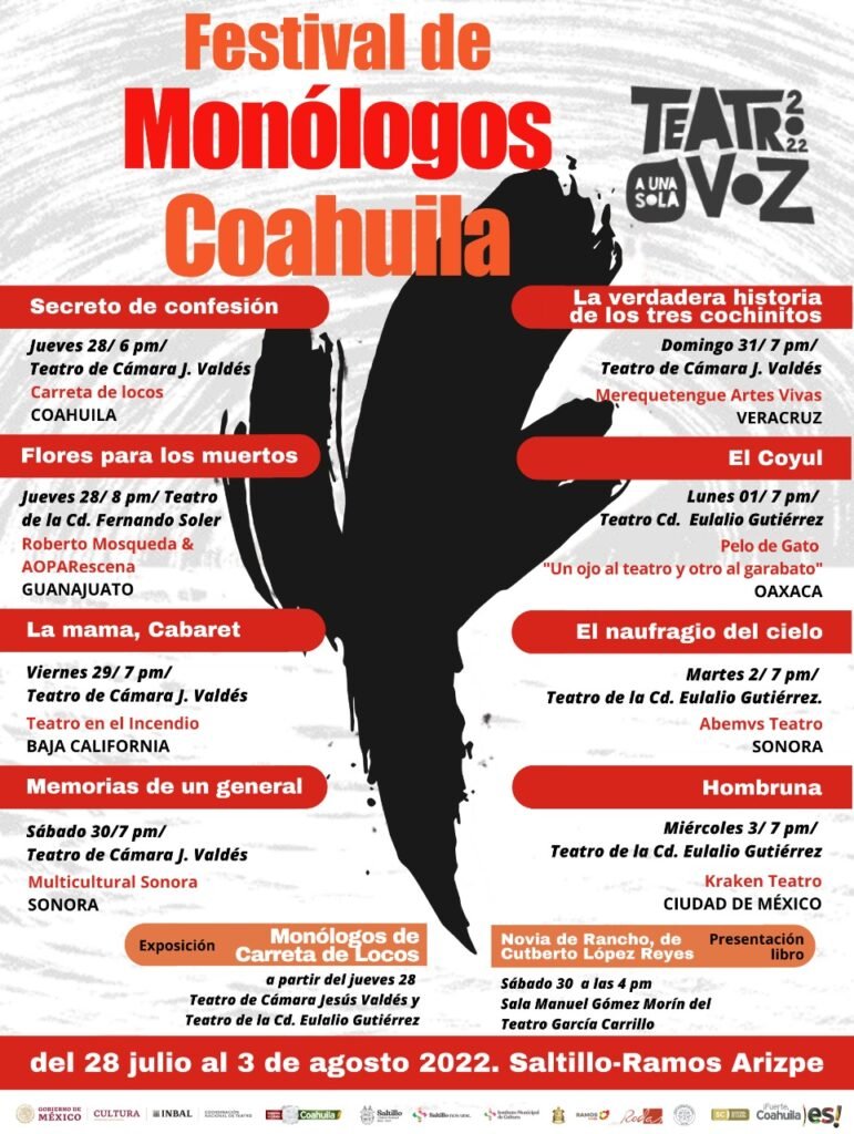 Posteriormente, en Ramos Arizpe el 1° de agosto, a las 19:00 horas en el Teatro de la Ciudad “Gral. Eulalio Gutiérrez” se presentará el monólogo “El coyul”, de Esmeralda Aragón, con el Grupo Pelo de Gato. “Un Ojo al Teatro y Otro al Garabato (Oaxaca)”; el día 2 de agosto, “El náufrago del cielo”, texto y dirección de Cutberto López, con Abemvs Teatro (Sonora); y el día 3 de agosto “Hombruna”, autoría y dirección de Richard Viqueira; dramaturgista y actriz: Valentina Garibay con Kraken Teatro (Ciudad de México).
