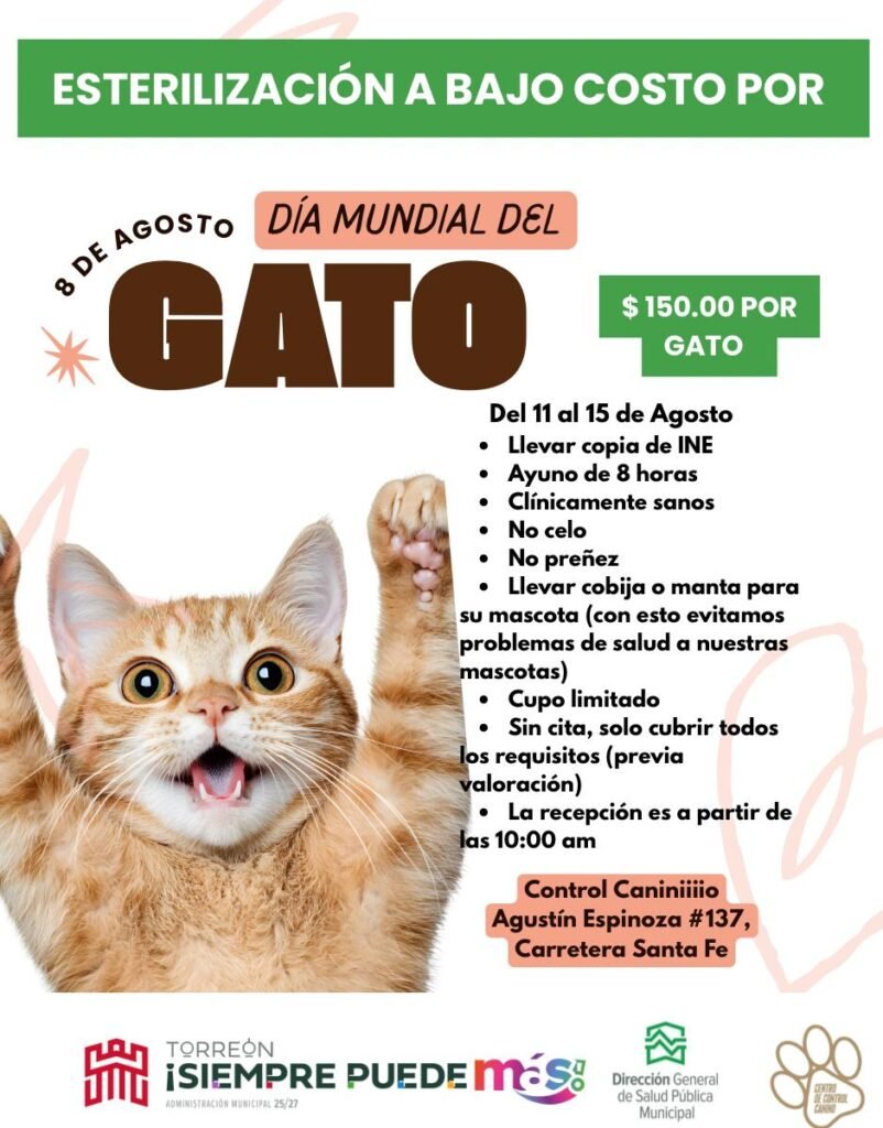 Torreón, Coahuila.- En el marco del Día Internacional del Gato, que se conmemora cada 8 de agosto, el Centro de Control Canino Municipal llevará a cabo una campaña especial de esterilización felina a partir de este lunes 11 y hasta el 15 de agosto, con el objetivo de fomentar la tenencia responsable y reducir el abandono de estos animales.
