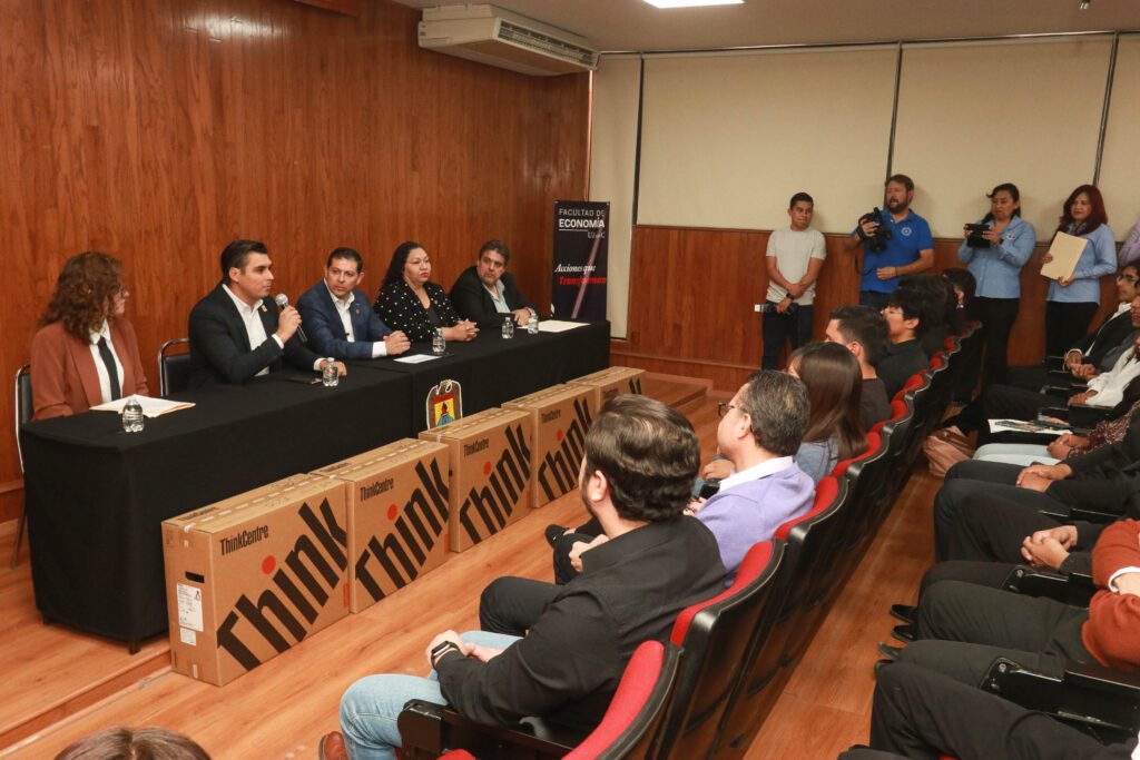 Saltillo, Coahuila.- En la Facultad de Economía Unidad Sureste de la Universidad Autónoma de Coahuila, tomó protesta el Capítulo Estudiantil del Colegio de Economistas de Coahuila A.C y el rector Octavio Pimentel Martínez, entregó al plantel 25 equipos de cómputo.