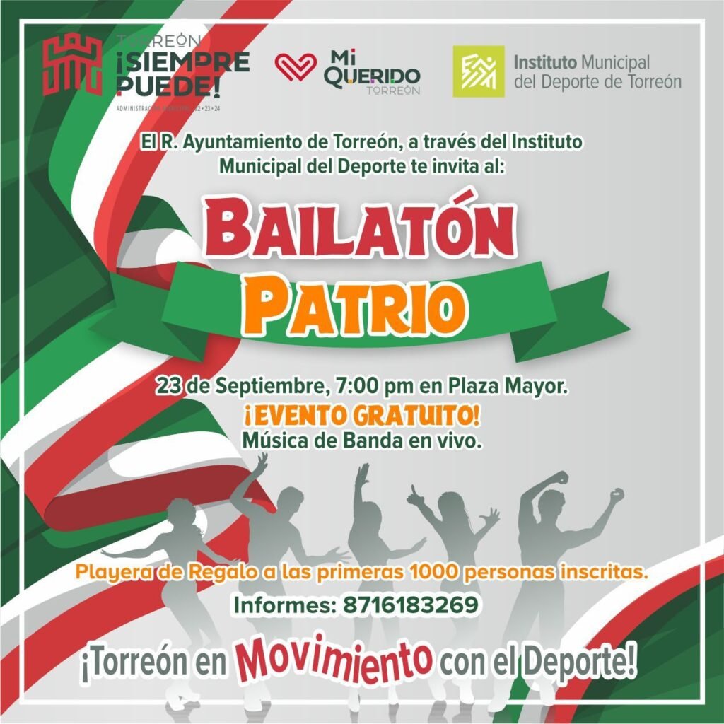 El Instituto Municipal del Deporte con el programa “Activa techumbre”, invita a los bailadores de la Comarca Lagunera a participar en el “Bailatón patrio”, este sábado 23 de septiembre a las 19:00 horas, donde habrá música de banda en vivo.