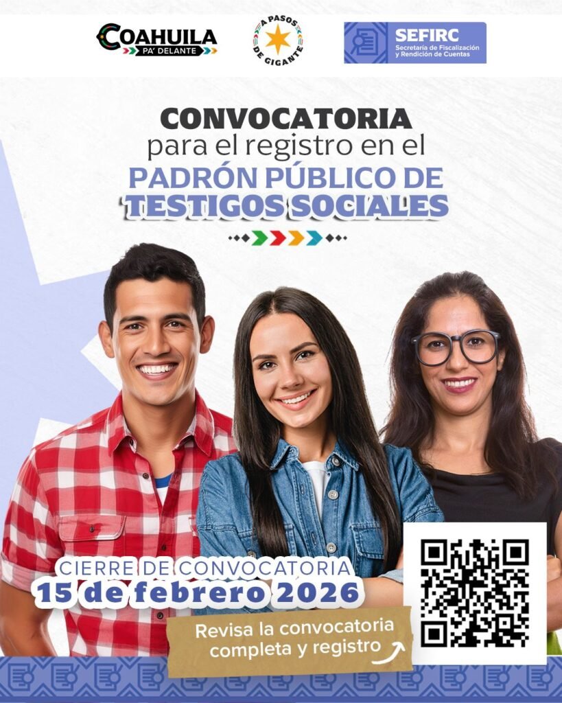 Personas Físicas y Organismos No Gubernamentales tienen hasta el próximo 15 de febrero del presente año para llenar el formulario y adjuntar la documentación requerida por medio del sitio web https://testigosocial.sefircoahuila.gob.mx/