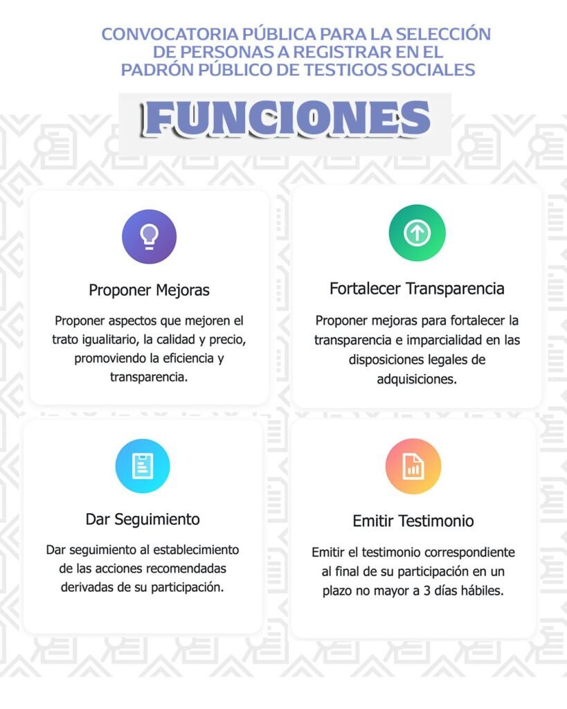 Entre las funciones de los Testigos Sociales destaca proponer mejoras en aspectos como calidad y precio, y fortalecer la transparencia e imparcialidad en las disposiciones legales de las adquisiciones; además dar seguimiento al establecimiento a las acciones recomendadas derivadas de su participación, y emitir el testimonio correspondiente al final de su participación, en un plazo no mayor a tres días hábiles.