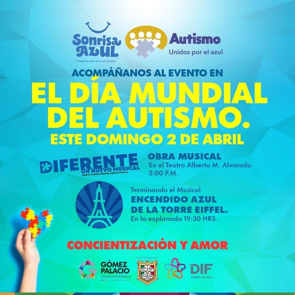 Gómez Palacio, Durango.- En el marco de la conmemoración del Día Mundial del Autismo, el Sistema para el Desarrollo Integral de la Familia (DIF), invita este domingo 2 de abril a disfrutar de la puesta en escena “Diferente un nuevo musical”, en las instalaciones del Teatro “Alberto M. Alvarado” y de ahí al encendido de color azul en la réplica de la Torre Eiffel, como muestra de apoyo y solidaridad a las personas con Trastorno del Espectro del Autismo (TEA) y sus familias.