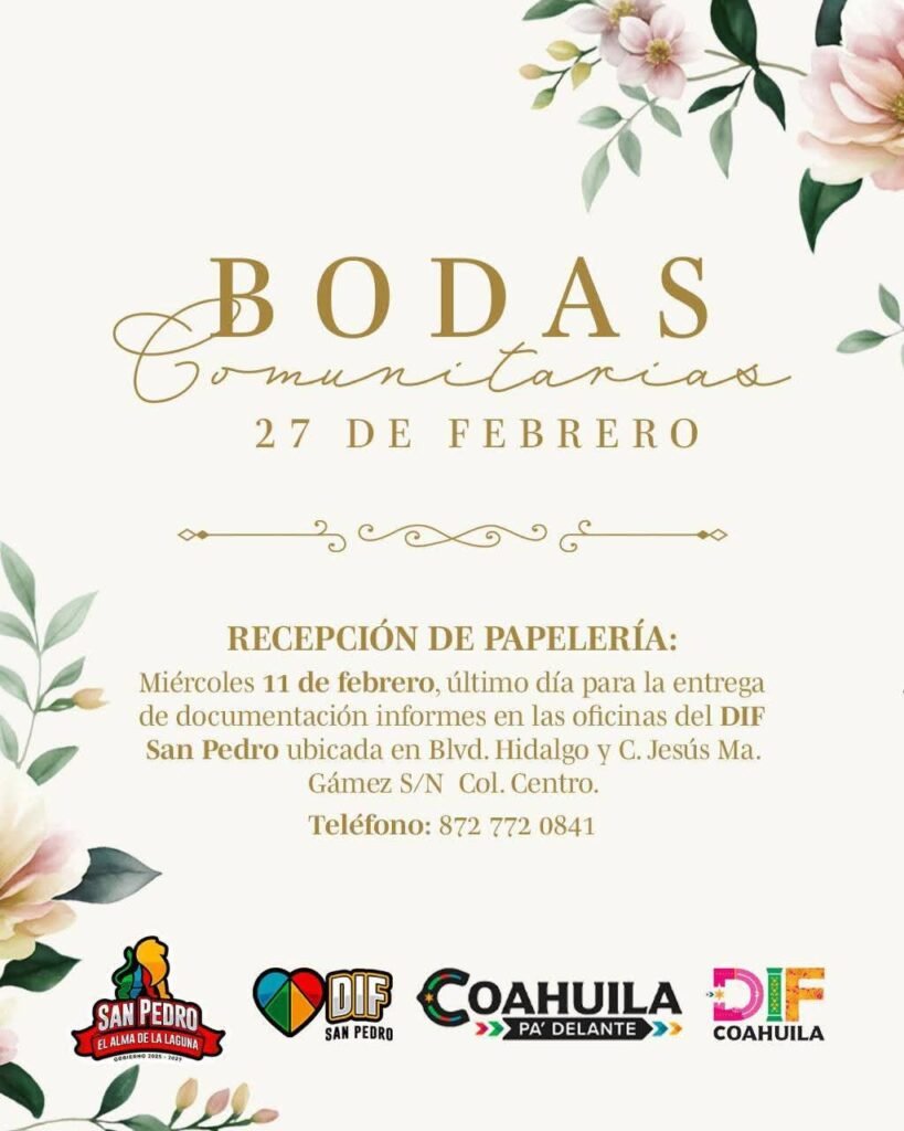San Pedro, Coahuila.- Con el objetivo de fortalecer a la sociedad y brindar certeza jurídica a las parejas, el DIF Municipal lanzó la convocatoria para participar en las Bodas Comunitarias, un programa que permite unir legalmente a las parejas de manera accesible.