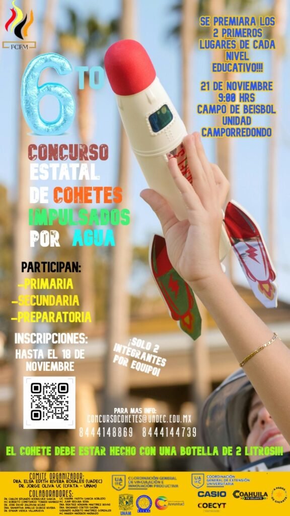 Saltillo, Coahuila.- La Universidad Autónoma de Coahuila, a través de la Facultad de Ciencias Físico Matemáticas (FCFM), invita a estudiantes de los niveles de primaria, secundaria y preparatoria a participar en el Sexto Concurso Estatal de Cohetes Impulsados por Agua, que se llevará a cabo el viernes 21 de noviembre de 2025 a partir de las 9:00 horas en la Unidad Camporredondo.