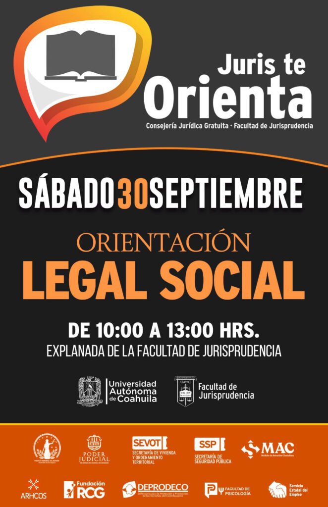 Con las jornadas de orientación legal social, la Facultad de Jurisprudencia de la Universidad Autónoma de Coahuila busca apoyar a quienes pasan por alguna situación legal y que requieren de asesoría, por lo que si tienes algún caso en particular que desees atender asiste.