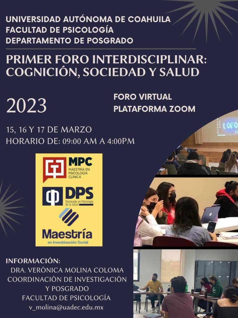 Saltillo, Coahuila.- La Facultad de Psicología Unidad Saltillo de la Universidad Autónoma de Coahuila, invita a la comunidad universitaria y público en general al Primer Foro Interdisciplinar: Cognición, Sociedad y Salud, el cual se desarrollará los días 15, 16 y 17 de marzo de 2023 de 9:00 a 15:30 horas a través de la plataforma Zoom.