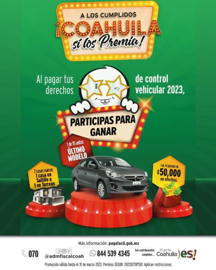 “A los cumplidos Coahuila sí los premia” participa por increíbles sorpresas, como una de dos casas nuevas (en Torreón o Saltillo), uno de 15 autos último modelo o uno de 40 premios de 50 mil pesos.