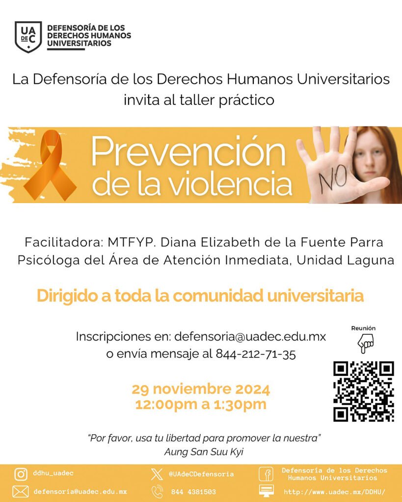Saltillo, Coahuila.- La Universidad Autónoma de Coahuila, a través de la Defensoría de los Derechos Humanos Universitarios (DDHU), invita a la comunidad universitaria de las Unidades Sureste, Laguna y Norte, a participar en el Taller “Prevención de la Violencia”, el cual se llevará a cabo por la plataforma Microsoft Teams el viernes 29 de noviembre de 2024 a las 12:00 horas.