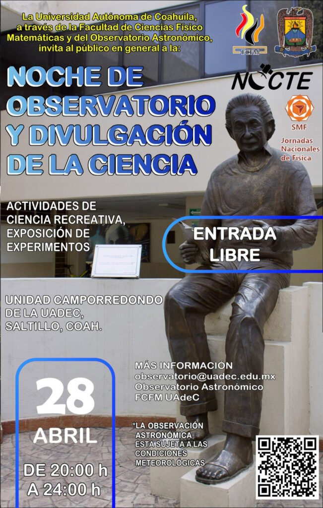 Saltillo, Coahuila.- A partir de las 8 de la noche este viernes 28 de abril, la Facultad de Ciencias Físico Matemáticas de la Universidad Autónoma de Coahuila, invita a acudir a la Noche del Observatorio para disfrutar de divertidas actividades científicas y aprender sobre los cuerpos celestes.