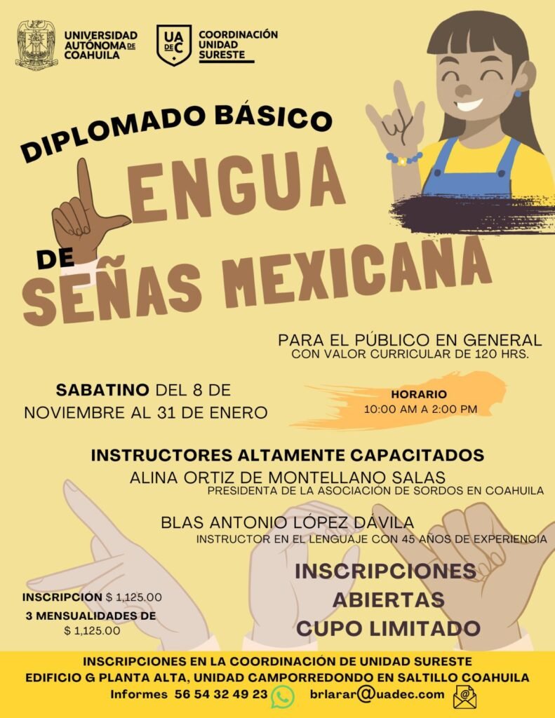 Saltillo, Coahuila.- La Universidad Autónoma de Coahuila, a través de la Coordinación de Unidad Sureste, invita a la comunidad universitaria y al público en general a inscribirse en el Diplomado Básico en Lengua de Señas Mexicana (LSM).