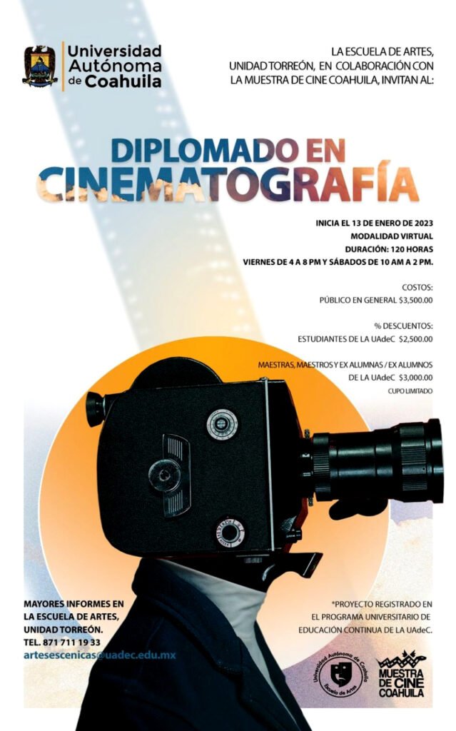 Torreón, Coahuila.- La Escuela de Artes Escénicas Unidad Torreón de la Universidad Autónoma de Coahuila, en colaboración con la Muestra de Cine Coahuila, invitan a la comunidad universitaria y público en general a participar en el Diplomado en Cinematografía que inicia el próximo 13 de enero de 2023, en modalidad virtual.