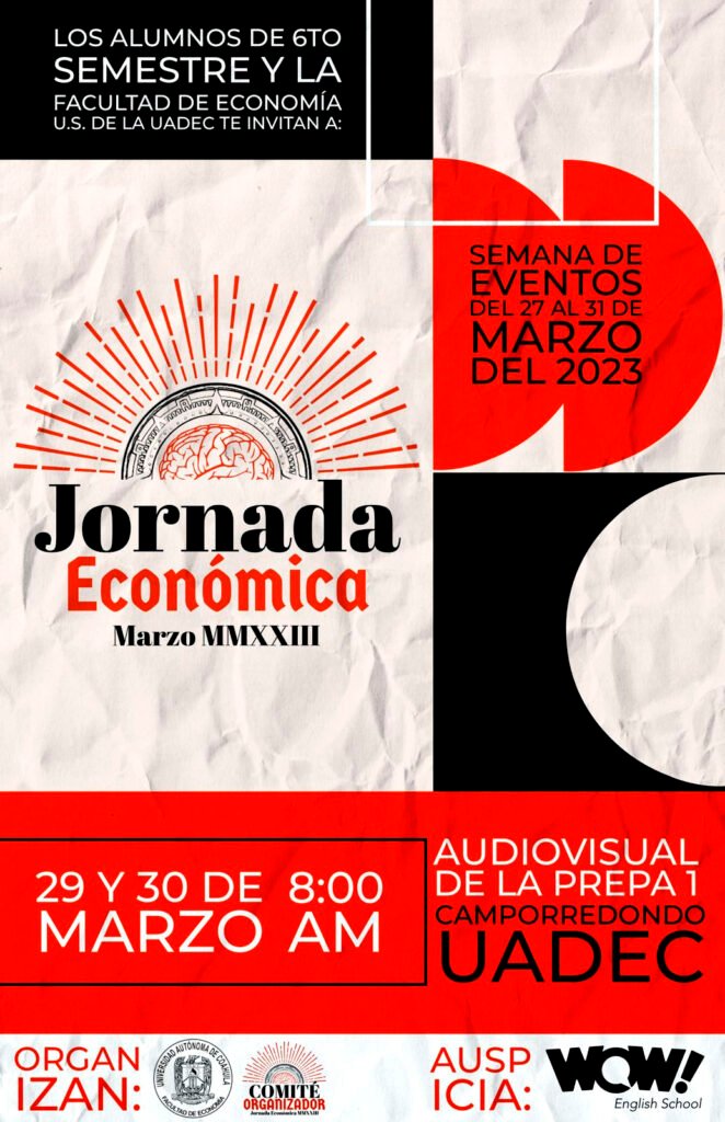Saltillo, Coahuila.- Con el objetivo de compartir conocimientos y experiencias acerca de la ciencia económica, alumnos de sexto semestre de la Facultad de Economía de la Universidad Autónoma de Coahuila, invitan a la comunidad universitaria y público en general a la Jornada Económica 2023, los días 29 y 30 de marzo.