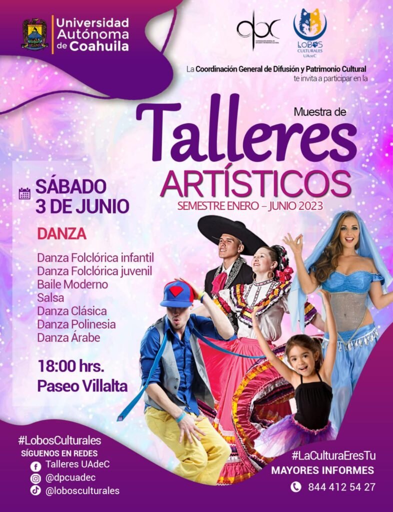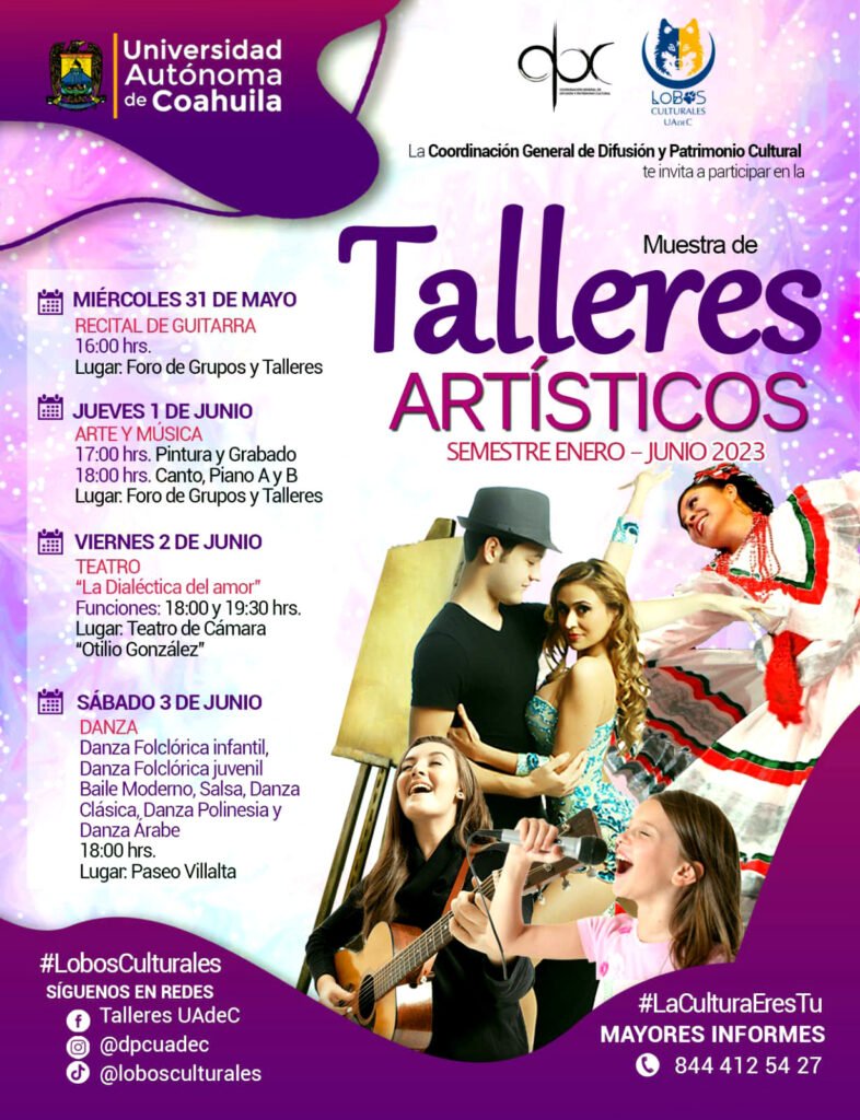 Saltillo, Coahuila.- La Universidad Autónoma de Coahuila a través de la Coordinación de Difusión y Patrimonio Cultural (DPC) invita a comunidad universitaria y público en general a la muestra final de Talleres Artísticos, impartidos en el semestre enero-junio 2023, que se desarrollará del 31 de mayo al 3 de junio.