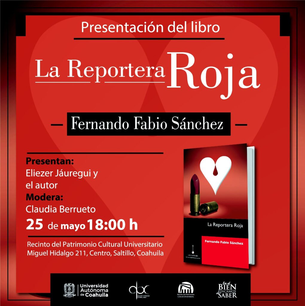 Saltillo, Coahuila.- La Universidad Autónoma de Coahuila a través de la Coordinación de Difusión y Patrimonio Cultural (DPC), invita a la comunidad universitaria y el público en general a la presentación del libro “La Reportera Roja” del autor Fernando Fabio Sánchez, el próximo 25 de mayo a las 18:00 horas en el Recinto del Patrimonio Cultural Universitario, ubicado en la calle Miguel Hidalgo, número 211 en el Centro Histórico de Saltillo.