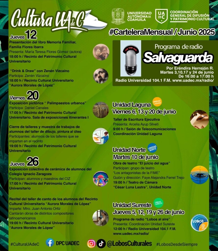 Saltillo, Coahuila.- La Universidad Autónoma de Coahuila a través de la Coordinación General de Difusión y Patrimonio Cultural (DPC), invita a la comunidad universitaria de las Unidades Sureste, Norte y Laguna, y al público en general a disfrutar de las actividades culturales programadas durante el mes de junio 2025.