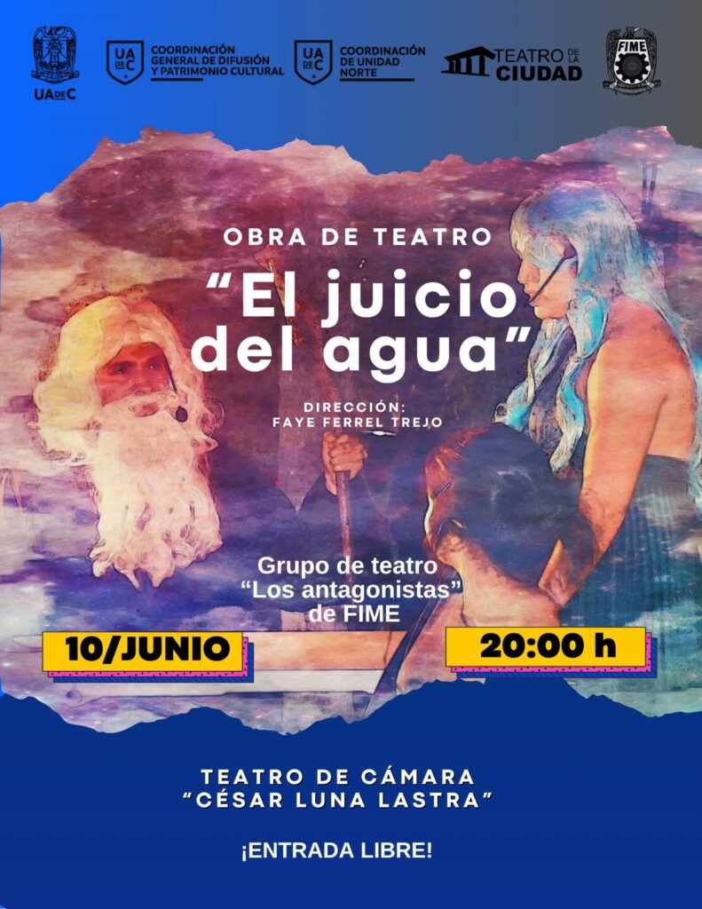 Unidad Norte estará presentando el martes 10 de junio la Obra de teatro «El juicio del agua», con la participación del grupo de teatro ‘Los antagonistas de la FIME», guion y dirección: Faye Alejandra Ferrel Trejo a las 19:00 horas en el Teatro de Cámara «Cesar Luna Lastra», Monclova, Coahuila.