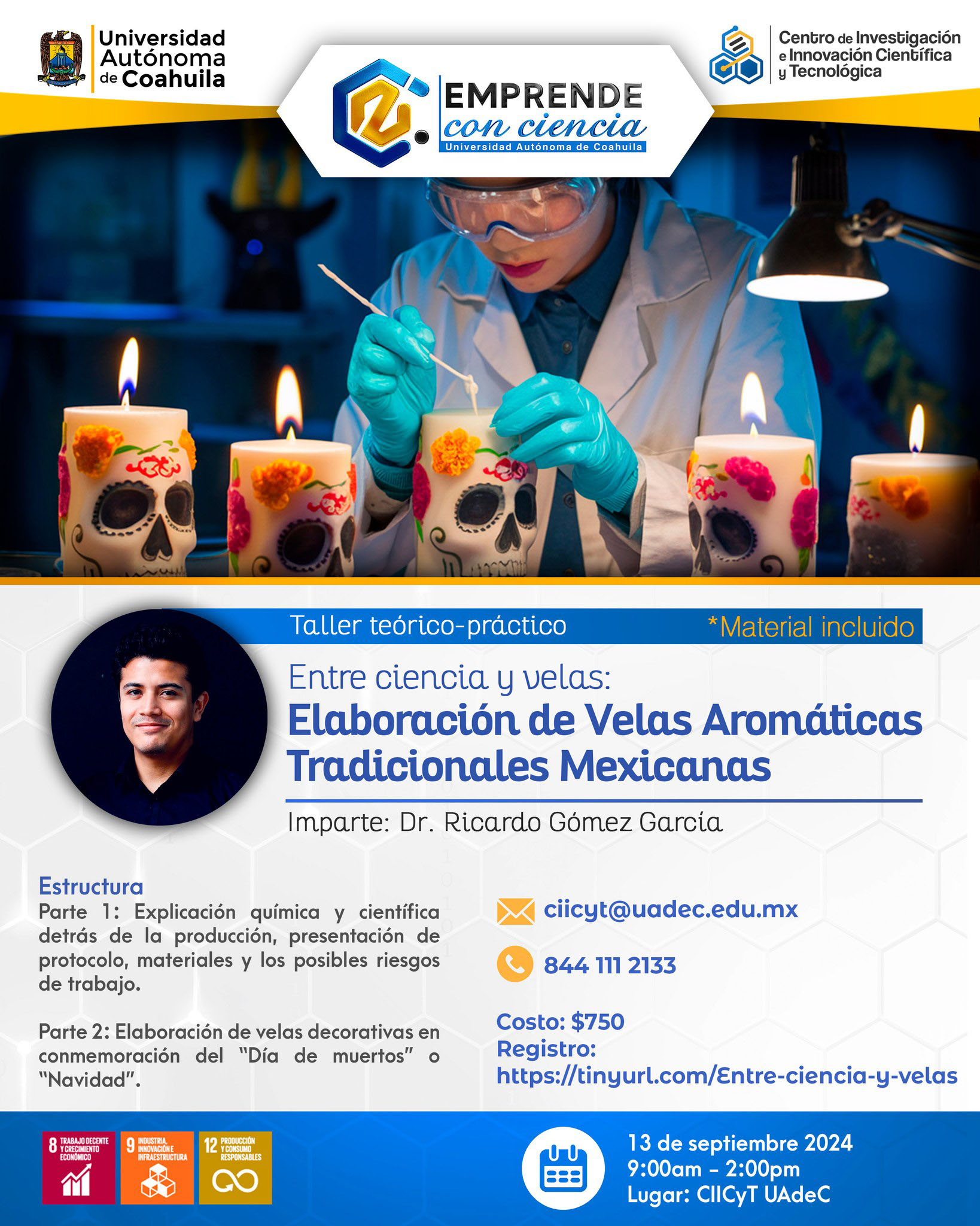 El objetivo de la actividad es desarrollar habilidades técnicas en la elaboración de velas aromáticas tradicionales mexicanas, integrando principios científicos para mejorar la calidad y optimizar el proceso de producción, será impartido por el Dr. Ricardo Gómez García y el Dr. Jorge Luis Guía García.