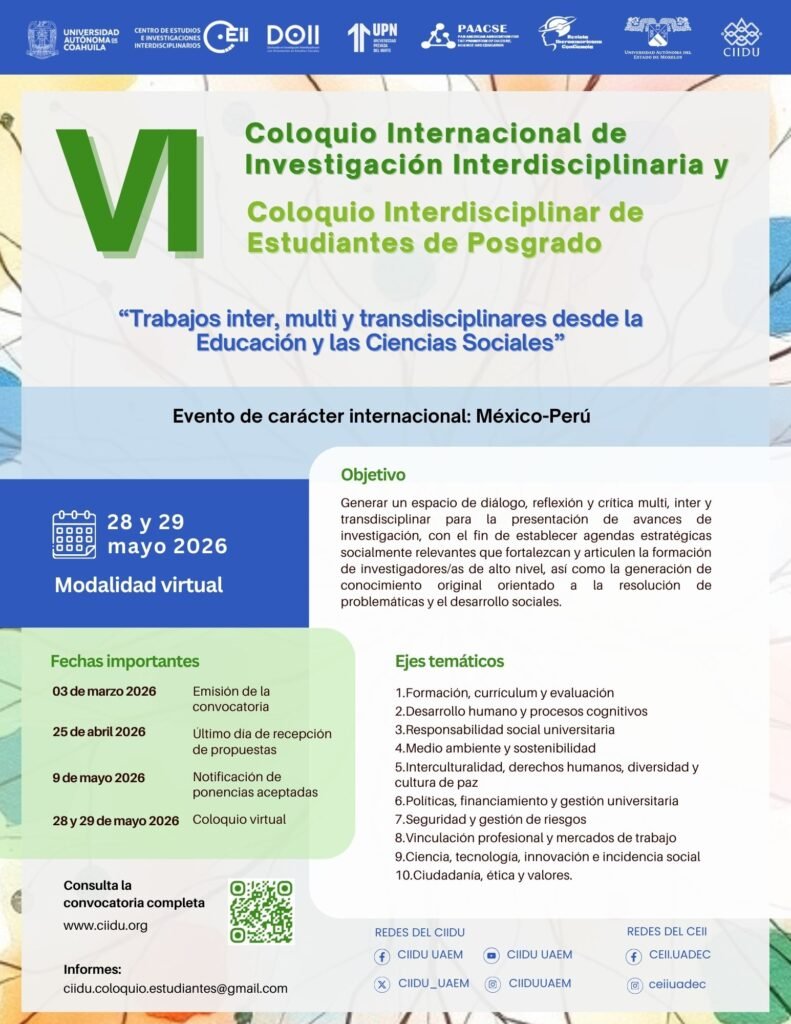 Saltillo, Coahuila.- La Universidad Autónoma de Coahuila a través del Centro de Estudios e Investigaciones Interdisciplinarios y el Doctorado en Investigación Interdisciplinaria con Orientación en Estudios Sociales, convocan a la población estudiantil y recién egresados de pre y posgrado a participar en el VI Coloquio Internacional de Investigación Interdisciplinaria y Coloquio Interdisciplinar de Estudiantes de Posgrado.