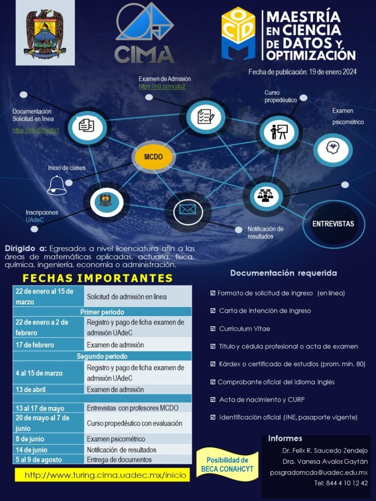 Saltillo, Coahuila.- La Universidad Autónoma de Coahuila a través del Centro de Investigación en Matemáticas Aplicadas (CIMA), convoca a egresados de nivel licenciatura afín a las áreas de matemáticas aplicadas, física, química, ingeniería, actuaría, economía o administración a ingresar a la Maestría en Ciencia de Datos y Optimización (MCDO) en el semestre agosto-diciembre 2024.