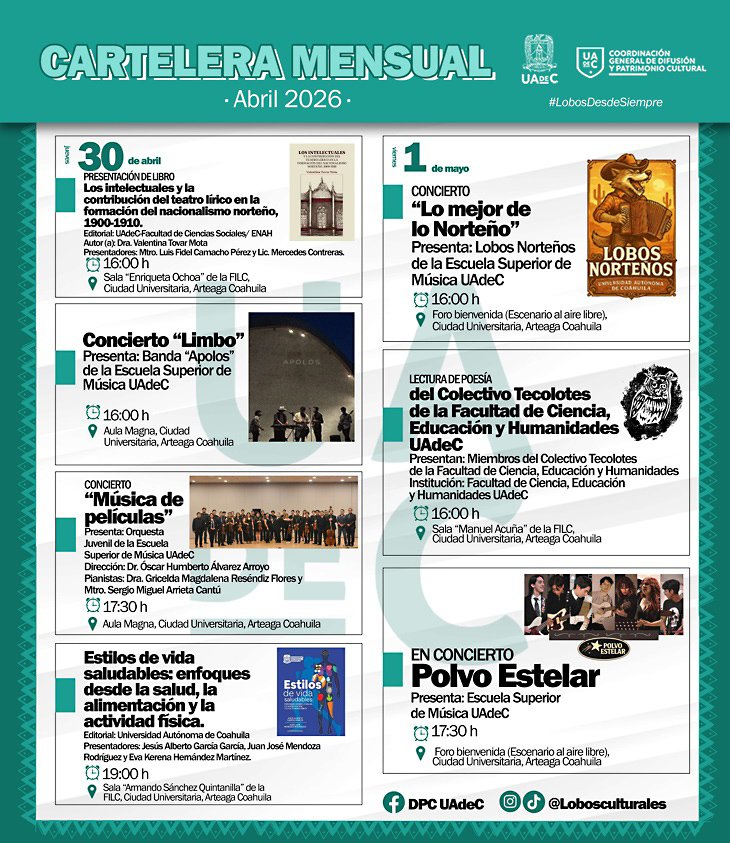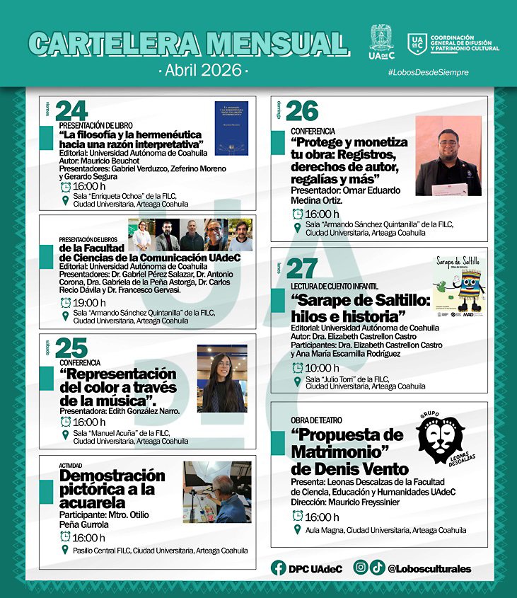 Arteaga, Coahuila.- La Universidad Autónoma de Coahuila, a través de la Coordinación General de Difusión y Patrimonio Cultural, da a conocer su participación en la Feria Internacional del Libro Coahuila (FILC) 2026, que se llevará a cabo del 24 de abril al 3 de mayo en el Centro Cultural Universitario de Arteaga, con una variada cartelera de actividades académicas, artísticas y literarias.