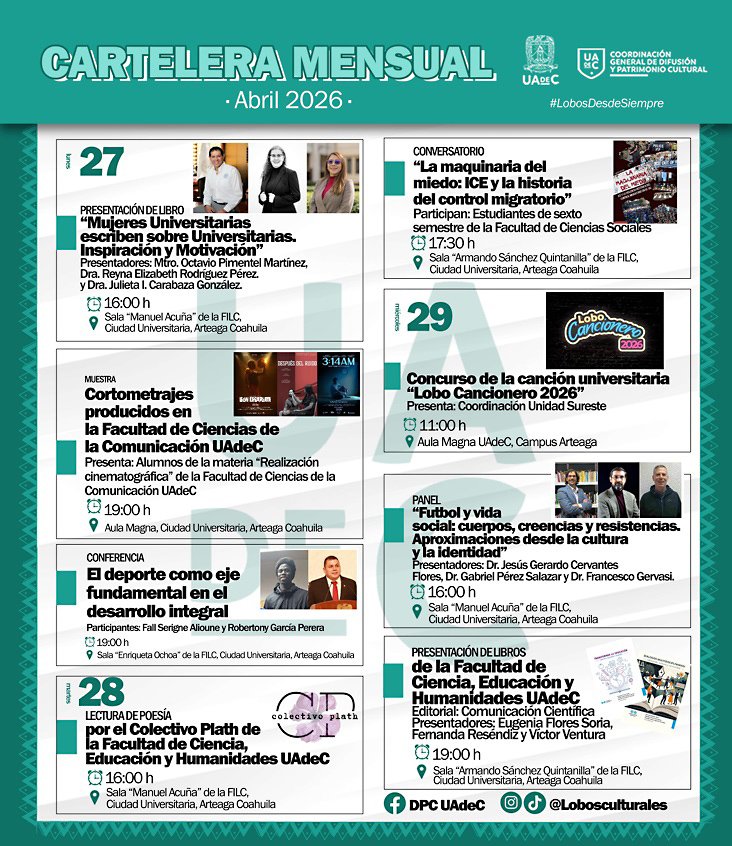 Mientras que el 29 de abril a las 11:00horas en el Aula Magna, se llevará a cabo el Concurso de la canción universitaria «Lobo Cancionero 2026», organizado por la Coordinación de Unidad Sureste; a las 16:00 horas el Panel «Futbol y vida social: cuerpos, creencias y resistencias. Aproximaciones desde la cultura y la identidad», a cargo de los presentadores Dr. Jesús Gerardo Cervantes Flores, Dr. Gabriel Pérez Salazar y Dr. Francesco Gervasi, posteriormente a las 19:00 horas en Sala “Armando Sánchez Quintanilla”, será la Presentación de Libros de la Facultad de Ciencia, Educación y Humanidades.