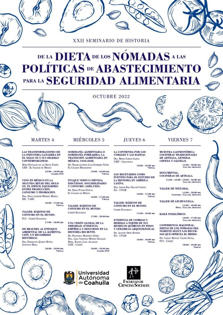 Saltillo, Coahuila.- Con el tema de “Dieta de los Nómadas a las Políticas de Abastecimiento para la Seguridad Alimentaria” se desarrollará el XXII Seminario de Historia que la Facultad de Ciencias Sociales de la Universidad Autónoma de Coahuila realizará del martes 4 al viernes 7 de octubre.