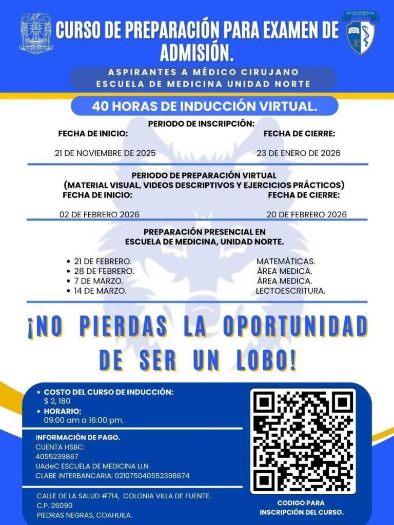 Piedras Negras, Coahuila.- La Universidad Autónoma de Coahuila a través de la Escuela de Medicina Unidad Norte, invita a participar en el Curso de Preparación para el Examen de Admisión dirigido a aspirantes a Médico Cirujano, el cual se llevará a cabo de manera virtual del 2 al 20 de febrero y presencial del 21 de febrero al 14 de marzo de 2026.