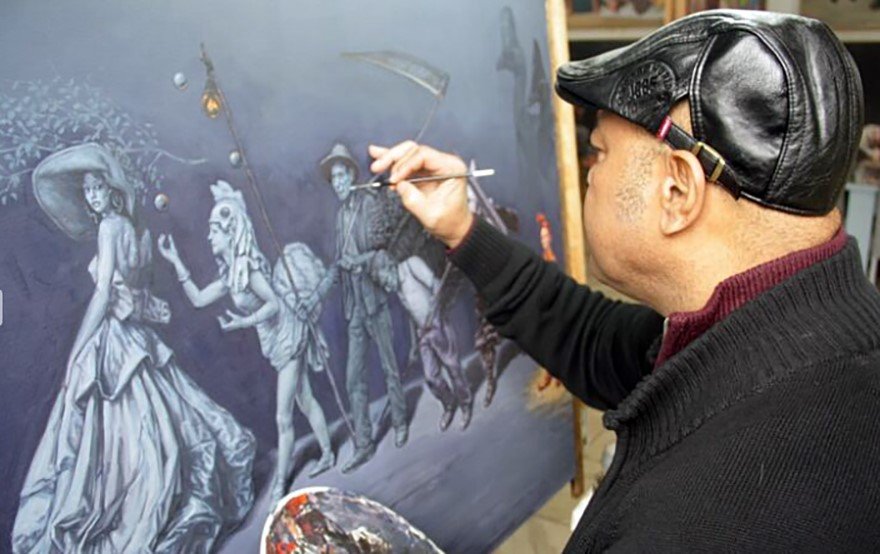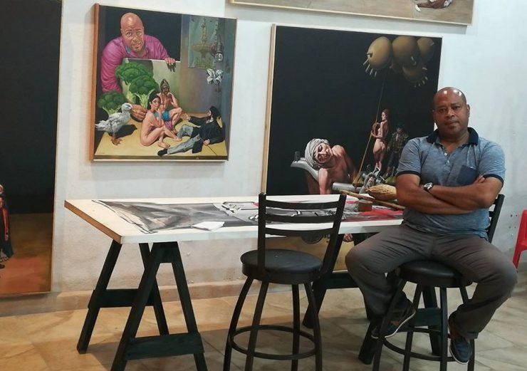Vizcaíno llegó a Saltillo, Coahuila, hace quince años, su arte se aleja de lo académico y fusiona influencias de Velázquez y Goya con símbolos contemporáneos.