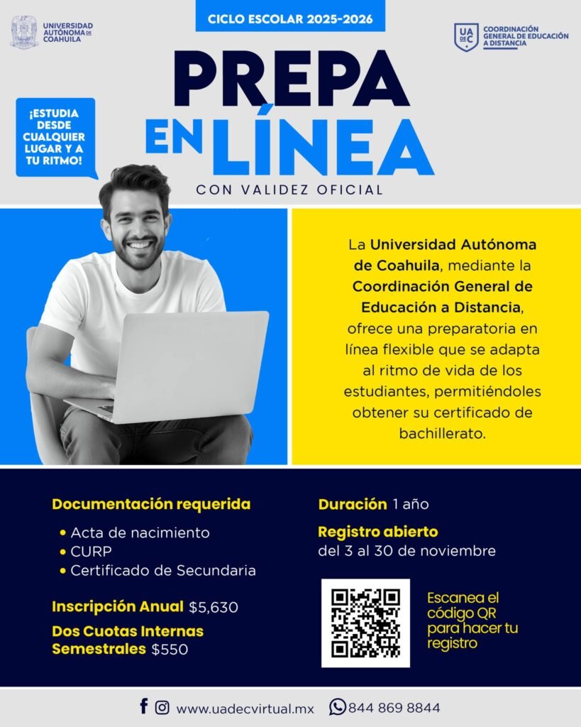 Saltillo, Coahuila.- La Universidad Autónoma de Coahuila a través de la Coordinación General de Educación a Distancia, ofrece el Bachillerato en Línea, por lo que convoca a las personas interesadas a realizar su registro en la página http://www.registrocged.uadec.mx/registro_login durante el mes de noviembre de 2025.