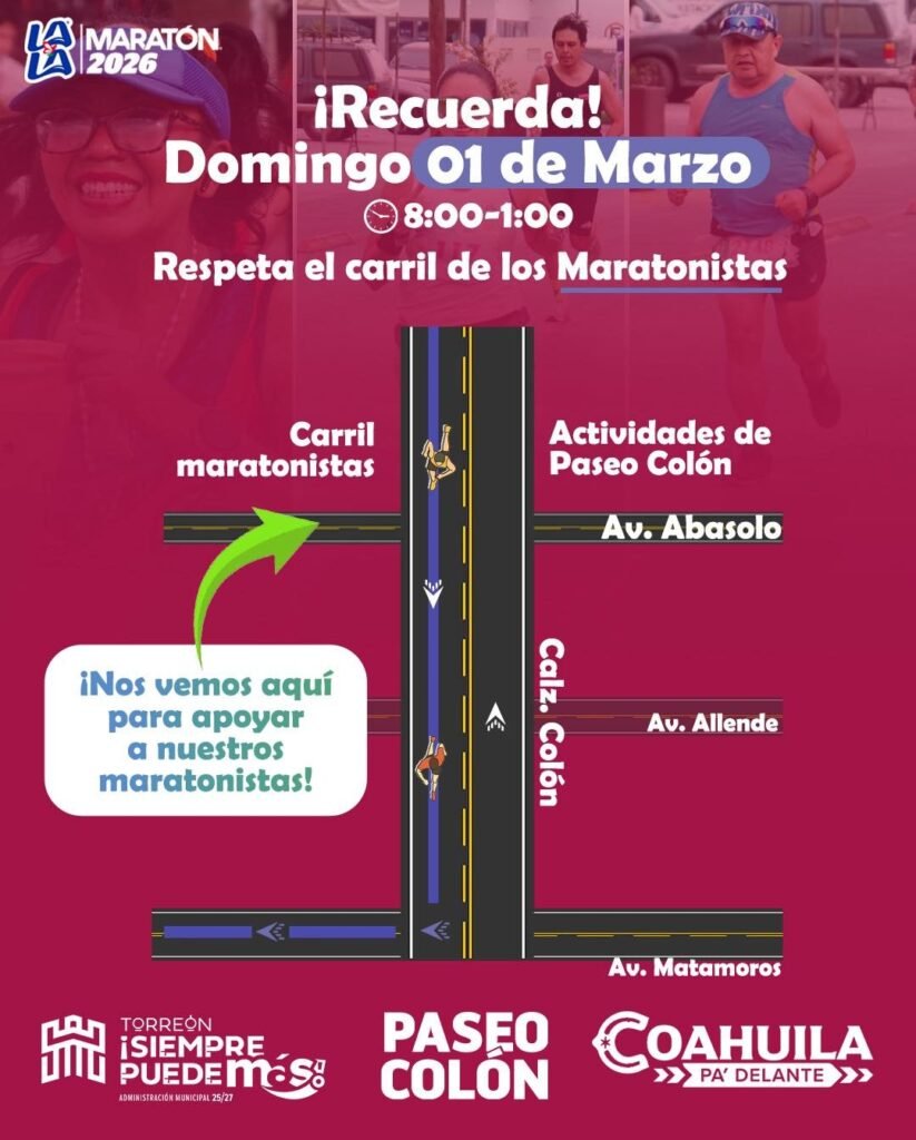 Torreón, Coahuila.- Con motivo del tradicional Maratón LALA 2026 que se llevará a cabo el próximo domingo 01 de marzo, la Administración Municipal exhorta a los asistentes del Paseo Colón, a respetar el carril de uso exclusivo para los corredores para evitar cualquier tipo de incidentes tanto para los espectadores como para los atletas.