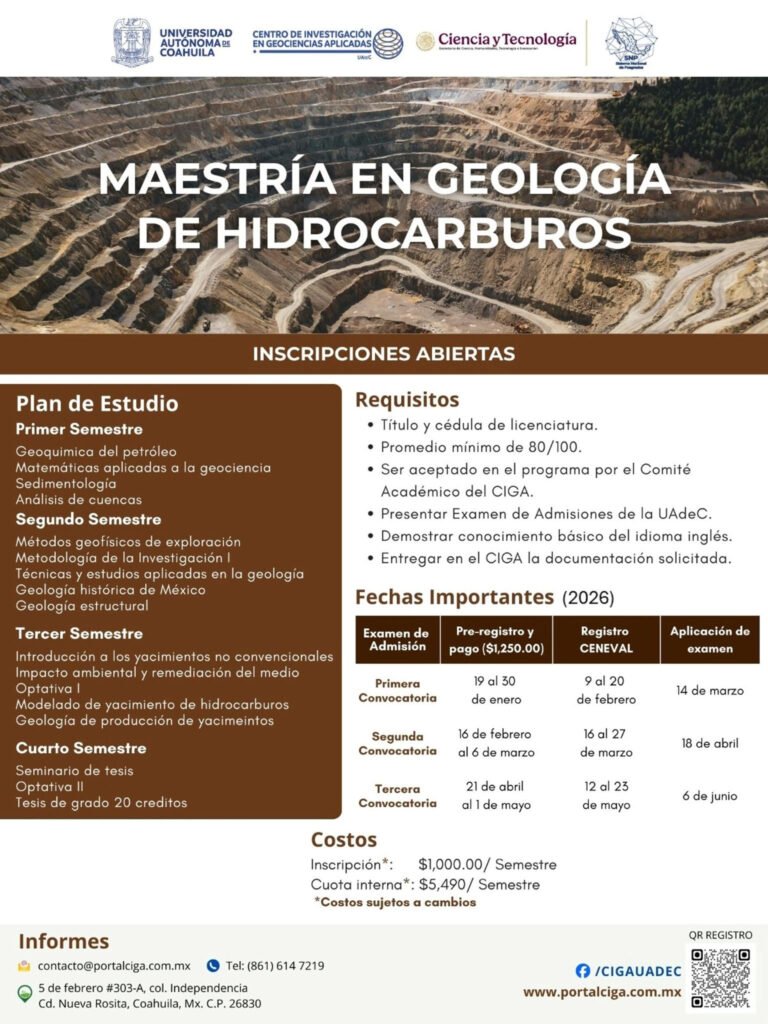 Nueva Rosita, Coahuila.- La Universidad Autónoma de Coahuila a través del Centro de Investigación en Geociencias Aplicadas (CIGA), convoca a personal que labora en industrias, unidades académicas y estudiantes afines a las Ciencias de la Tierra a cursar la Maestría en Geología de Hidrocarburos.
