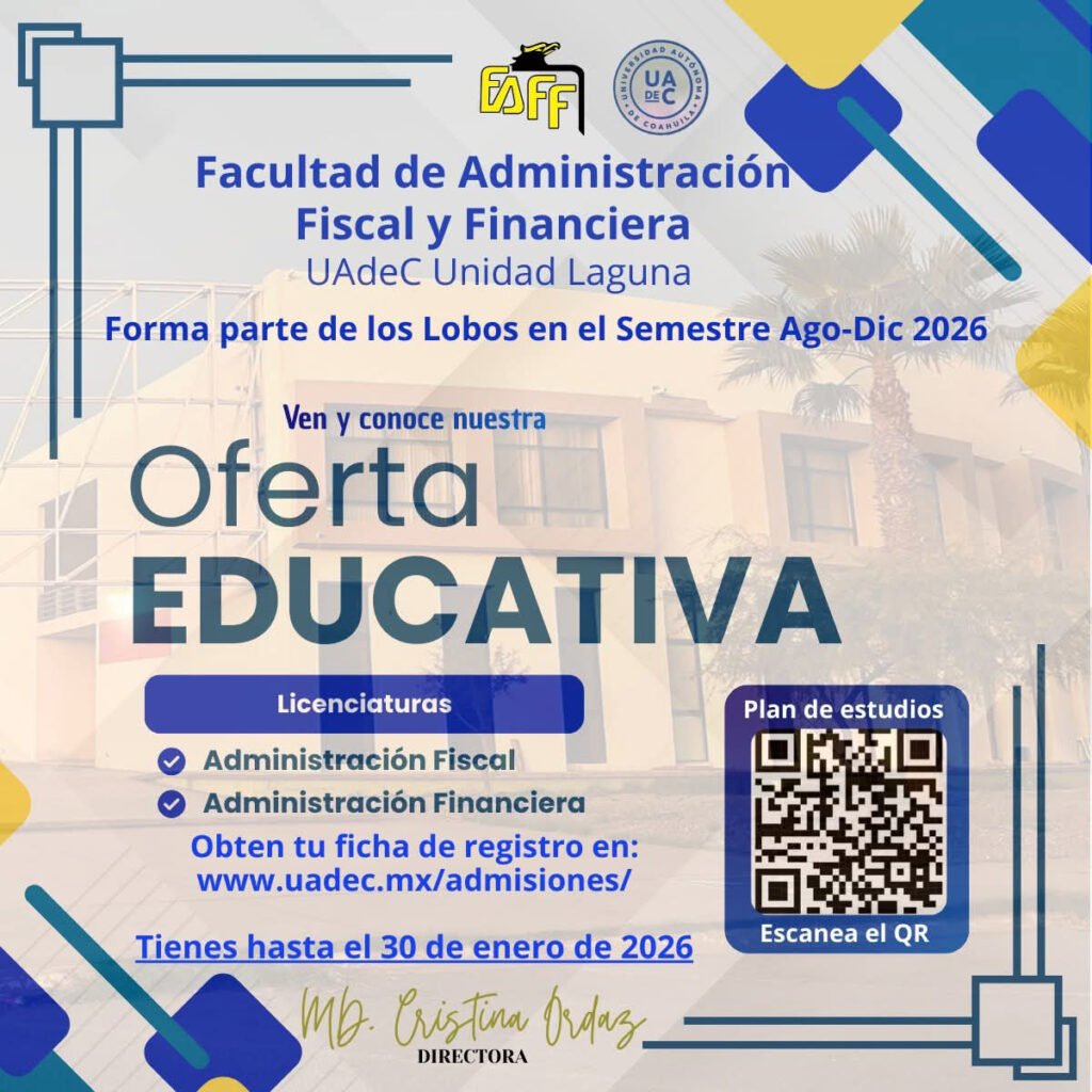 El registro para ficha de admisión en la UAdeC, vence el 30 de enero de 2026 en www.uadec.mx/admisiones/ para más información los interesados pueden enviar un mensaje a través del Whatsapp 871 1398228, en las redes sociales Facebook: Somos FAFF e Instagram: somos FAFF, o acudir a las instalaciones de la Facultad de Administración Fiscal y Financiera, ubicada en Ciudad Universitaria de la UAdeC en Carretera Torreón-Matamoros km 7.5, en Torreón, Coahuila.