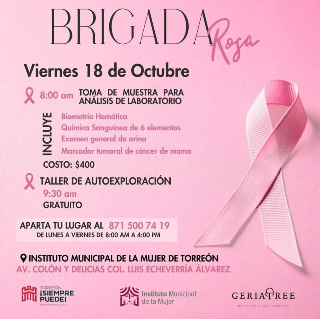 Torreón, Coahuila.- En el marco del mes de sensibilización sobre el cáncer de mama, el Instituto Municipal de la Mujer (IMM) Torreón, invita a las actividades que se desarrollarán dentro de la “Brigada Rosa”, el próximo viernes.