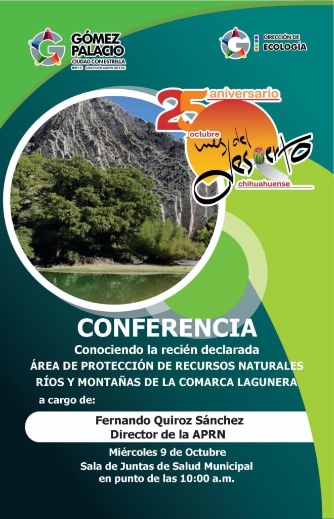Gómez Palacio, Durango.- El Ayuntamiento de Gómez Palacio, a través de la Dirección de Ecología y Protección al Ambiente, invita a la ciudadanía a la conferencia “Conociendo la Recién Declarada Área de Protección de Recursos Naturales Ríos y Montañas de la Comarca Lagunera”.