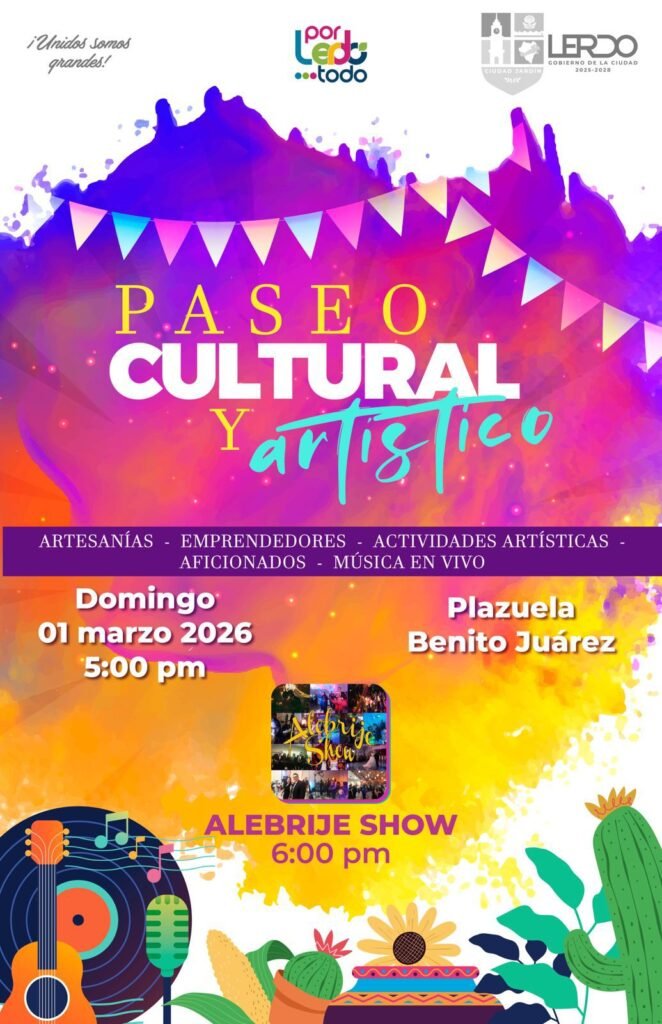 Lerdo, Durango.- El Gobierno Municipal de Lerdo, a través del Instituto Municipal de Turismo y el programa Tu Fin de Semana en Lerdo, invitan a toda la población para unirse este domingo 01 de marzo al Festival Cultural y Artístico que se llevará a cabo en la Plazuela Benito Juárez, a partir de las 5:00 de la tarde.