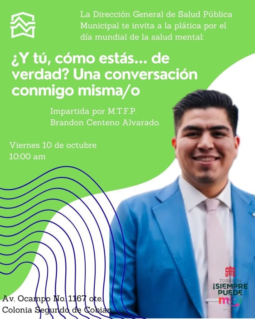 Torreón, Coahuila.- En el marco del Día Mundial de la Salud Mental que se conmemora cada 10 de octubre, la Dirección de Salud Pública Municipal hace un llamado a la ciudadanía a reflexionar sobre la importancia del bienestar emocional para una vida plena y equilibrada.