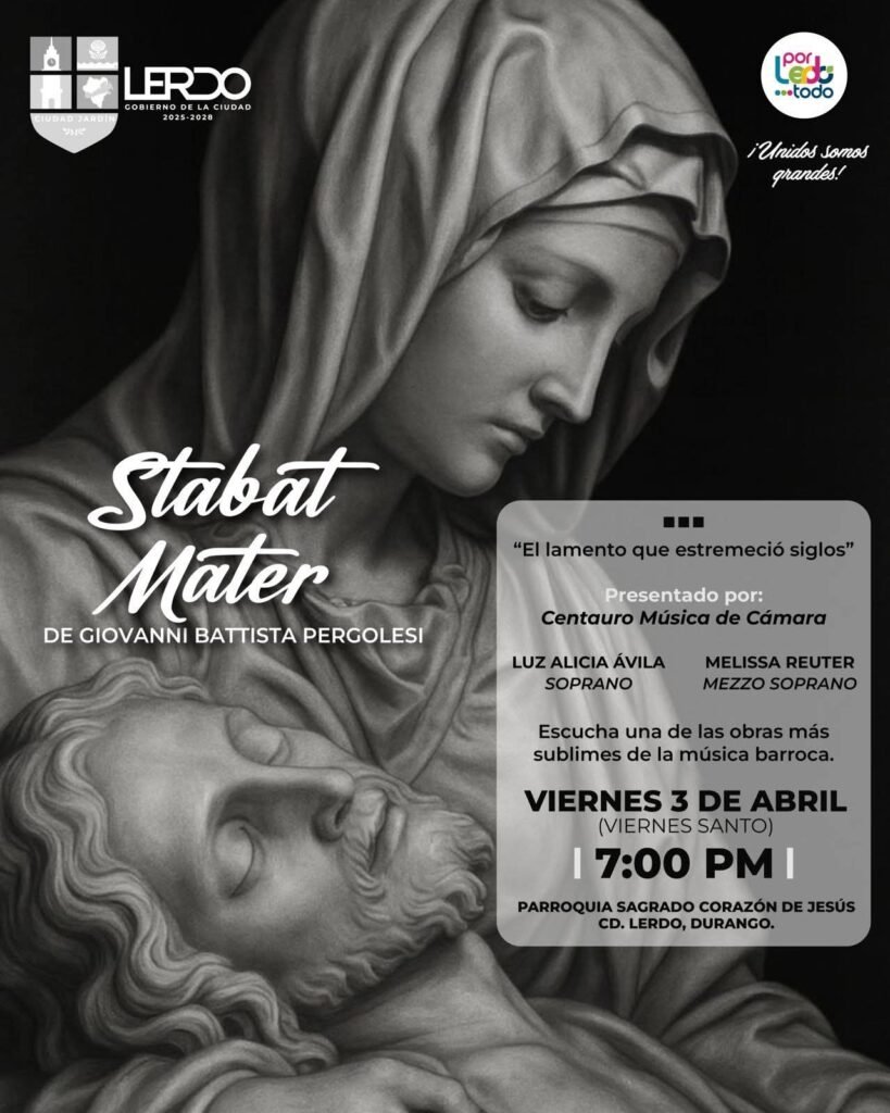 Lerdo, Durango.- El Gobierno de Lerdo, a través de la Dirección de Arte y Cultura, invita a la ciudadanía para sumarse este Viernes Santo, 03 de abril, al Concierto de Música Sacra en la Parroquia del Sagrado Corazón de Jesús, a las 7:00 de la noche.