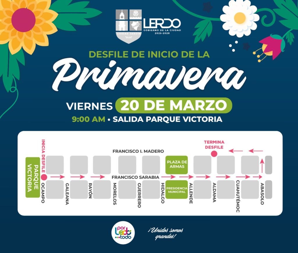 Lerdo, Durango.- El Gobierno Municipal de Lerdo invita a la ciudadanía este viernes 20 de marzo al Desfile de Inicio de Primavera, que se desarrollará en la avenida Francisco Sarabia a las 9:00 de la mañana.