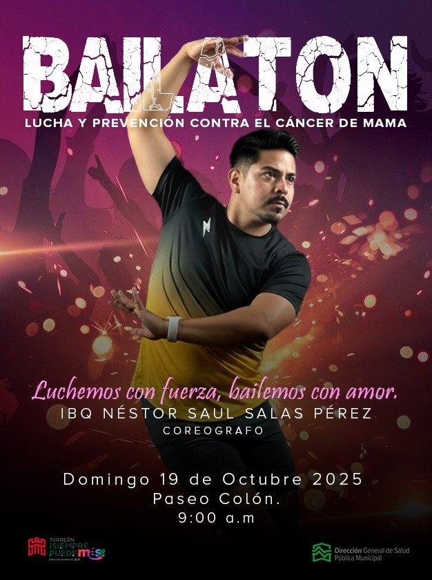 Torreón, Coahuila.- En el marco de la conmemoración del Día Mundial de la Lucha contra el Cáncer de Mama, el 19 de octubre, la Dirección de Salud Pública Municipal invita a las mujeres de Torreón a participar en el Gran Bailatón, evento que busca fomentar la conciencia sobre la prevención de esta enfermedad, y al mismo tiempo celebrar la vida, la salud y la fuerza de quienes la han enfrentado.