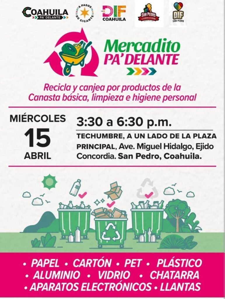 San Pedro, Coahuila.- El Gobierno del Estado, en coordinación con el Gobierno Municipal, invita a la comunidad a participar en el programa “Mercadito Pa’delante”, una iniciativa del gobernador Manolo Jiménez Salinas, que promueve el cuidado del medio ambiente y el apoyo a la economía familiar.
