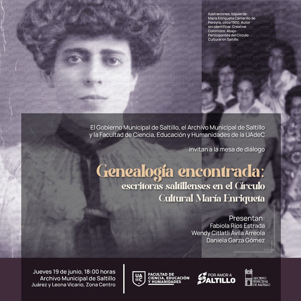 Saltillo, Coahuila.- Como parte del esfuerzo por rescatar la memoria literaria de mujeres del noreste mexicano, la Facultad de Ciencia, Educación y Humanidades (FCEyH) de la Universidad Autónoma de Coahuila, en colaboración con el Gobierno Municipal y el Archivo Municipal de Saltillo, invitan a la Mesa de Diálogo “Genealogía encontrada: escritoras saltillenses en el Círculo Cultural María Enriqueta”.