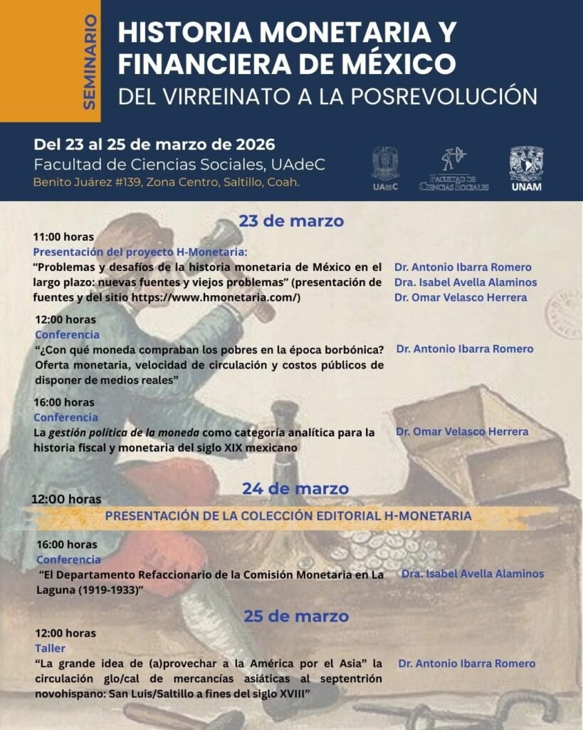 Saltillo, Coahuila.- La Universidad Autónoma de Coahuila a través de la Facultad de Ciencias Sociales Unidad Sureste, en conjunto con la Facultad de Economía de la Universidad Nacional Autónoma de México (UNAM), invitan a la comunidad universitaria y público en general al Seminario “Historia monetaria y financiera de México del virreinato a la posrevolución”, que se llevará a cabo en Benito Juárez #139 en la Zona Centro de Saltillo del 23 al 25 de marzo de 2026.