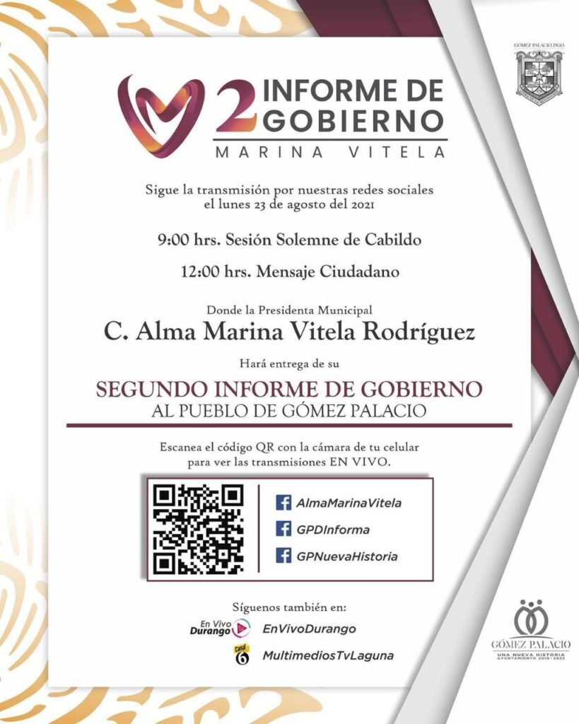 A todo el pueblo de Gómez Palacio, se hace una cordial invitación para seguir totalmente en vivo la transmisión en Facebook Live del 2do Informe de Gobierno de la alcaldesa Marina Vitela, este lunes 23 de agosto 2021.